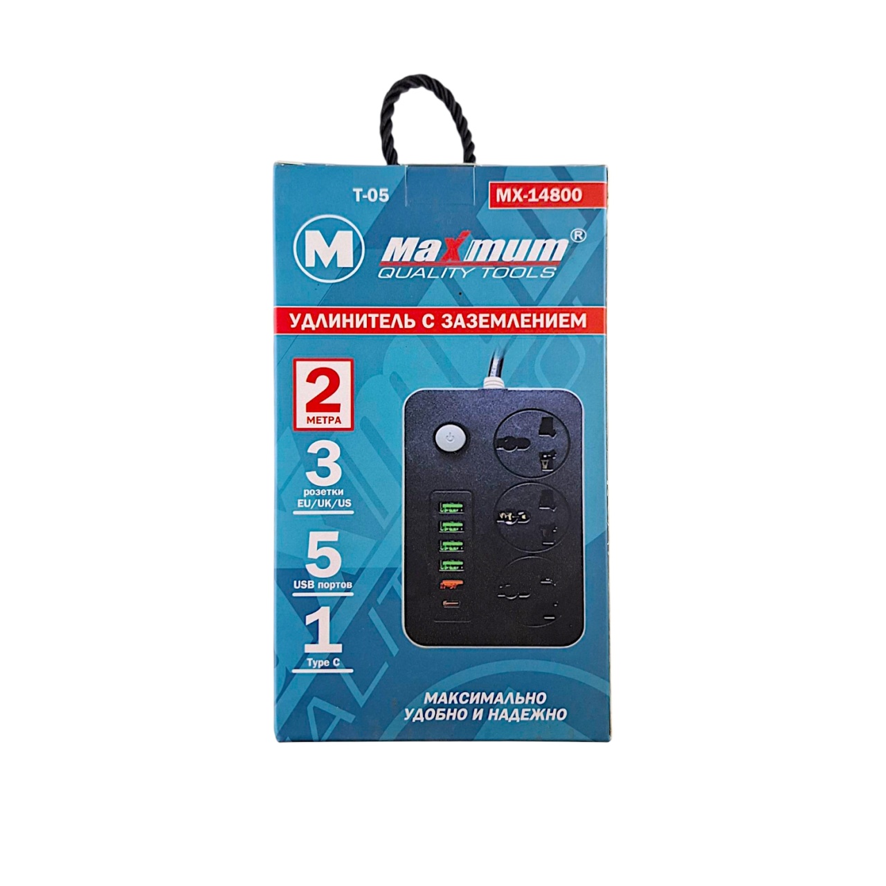 Удлинитель с заземлением 2 м, глубокий, 3 EURO розетки, 5 USB портов,Type C, U 314, "MAXIMUM" MX 147