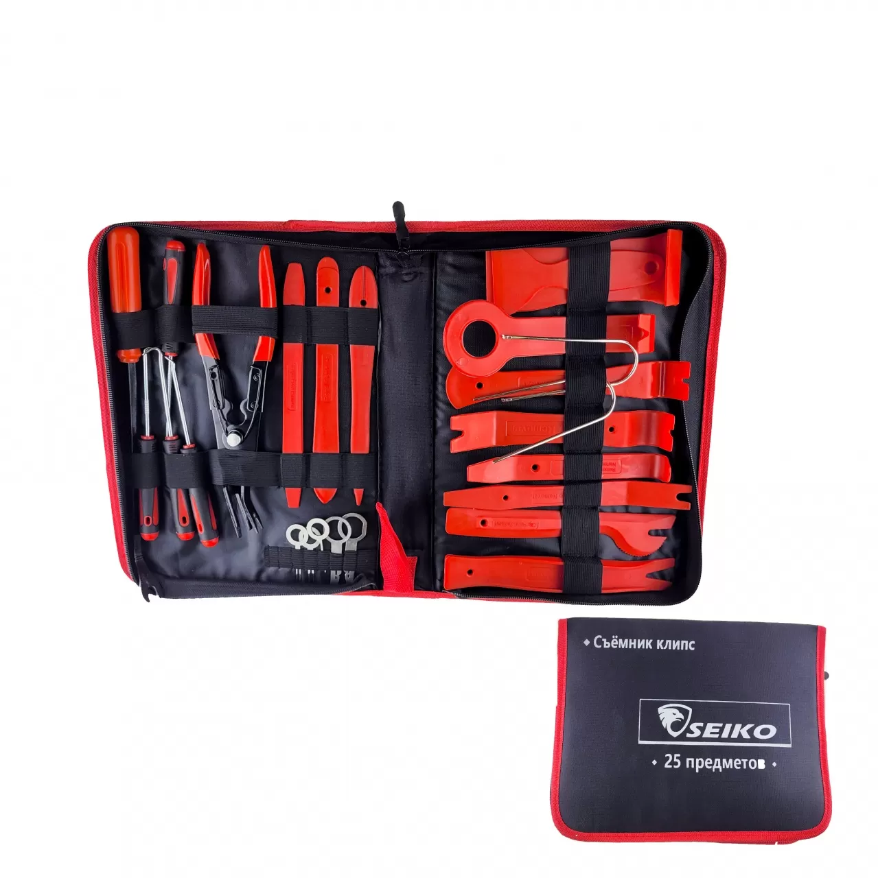Съемники клипс, клемм и зажимов обладают высокой твердостью, поэтому эффективны при удалении прочно скрепленных элементов. Набор инструментов для снятия обшивки поставляется с портативным чехлом на молнии, удобным для хранения и переноски инструментов.