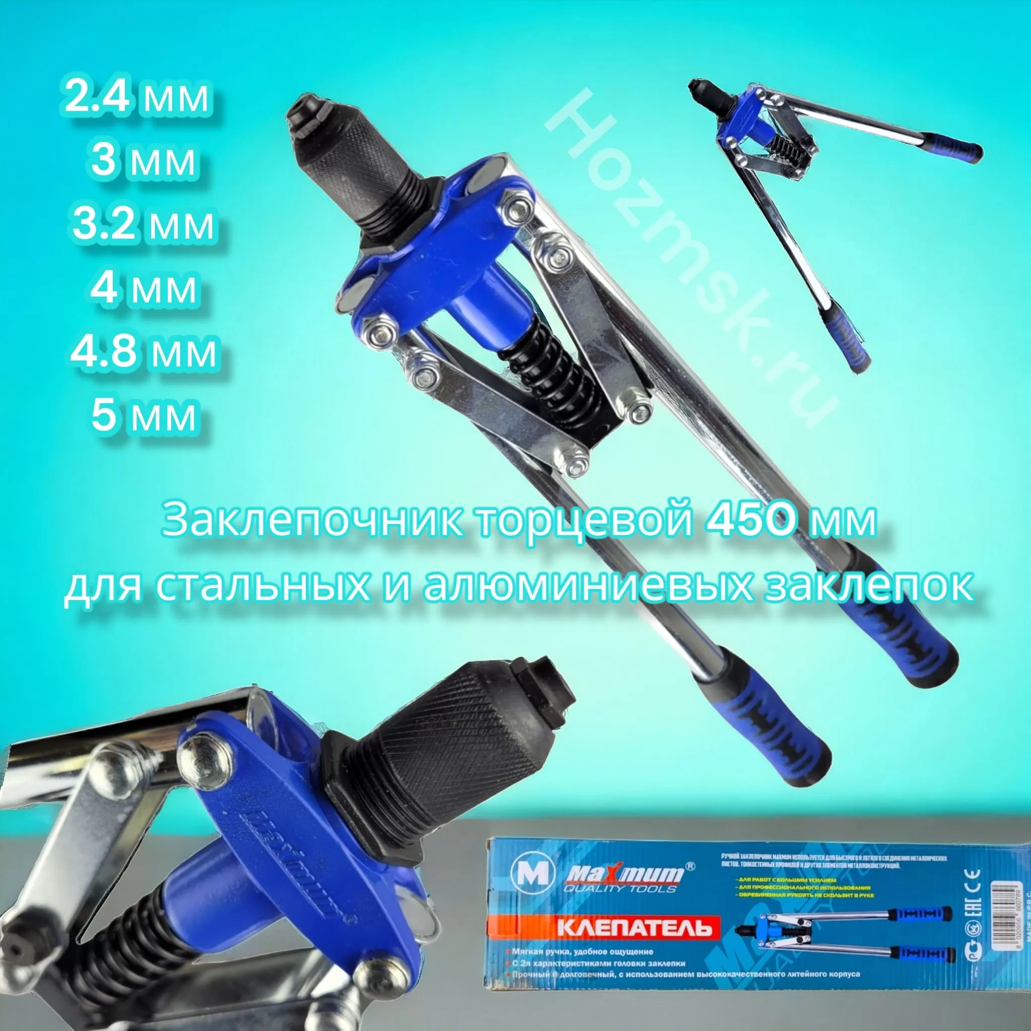 Усиленный механический заклепочник от "Maximum Quality Tools" выдерживает высокие рабочие нагрузки и предназначен для установки заклепок из алюминия. Повышенная прочность инструмента достигается благодаря тому, что рабочие губки изготовлены из стали и закалены. Специальный механизм - мультипликатор, позволяет снизить усилие, необходимое для установки заклёпки. Корпус изготовлен из специального сплава методом литья под давлением и покрыт лакокрасочным покрытием, предотвращающим появление коррозии.